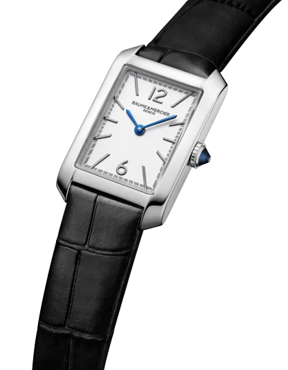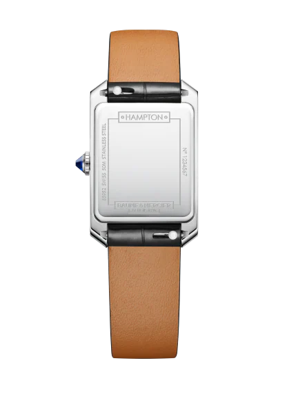 L’Hampton 10795 è ornato da un quadrante opalino bianco-argenteo con numeri arabi e indici rodiati rivettati e lancette a forma di spada blu. La cassa rettangolare in acciaio inossidabile lucidato è dotata di una corona in acciaio a forma di cabochon e di uno spinello sintetico blu incastonato. Il cinturino intercambiabile in pelle nera con motivo alligatore è dotato di un affidabile sistema di sostituzione senza attrezzi.