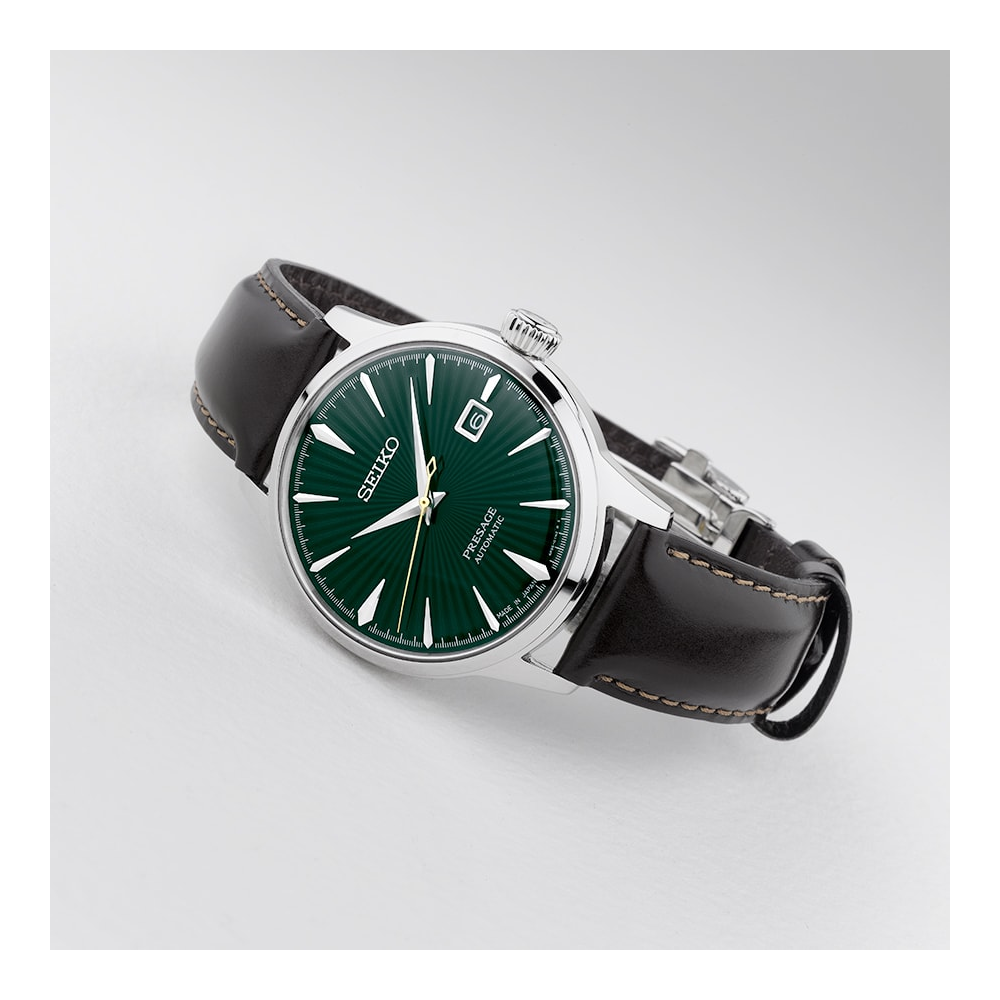 I modelli della collezione PRESAGE Cocktail si riconoscono facilmente per il quadrante a raggiera con effetto sunray. La loro elegante semplicità estetica è in perfetta sintonia con la tradizione giapponese. Il verde del quadrante di questo modello è ispirato al colore del cocktail “Mockingbird”, a base di tequila, liquore alla menta e lime. Abbinato al cinturino in pelle marrone scuro per uno stile elegante, ma comodo, questo orologio automatico è semplicemente perfetto in ogni occasione.