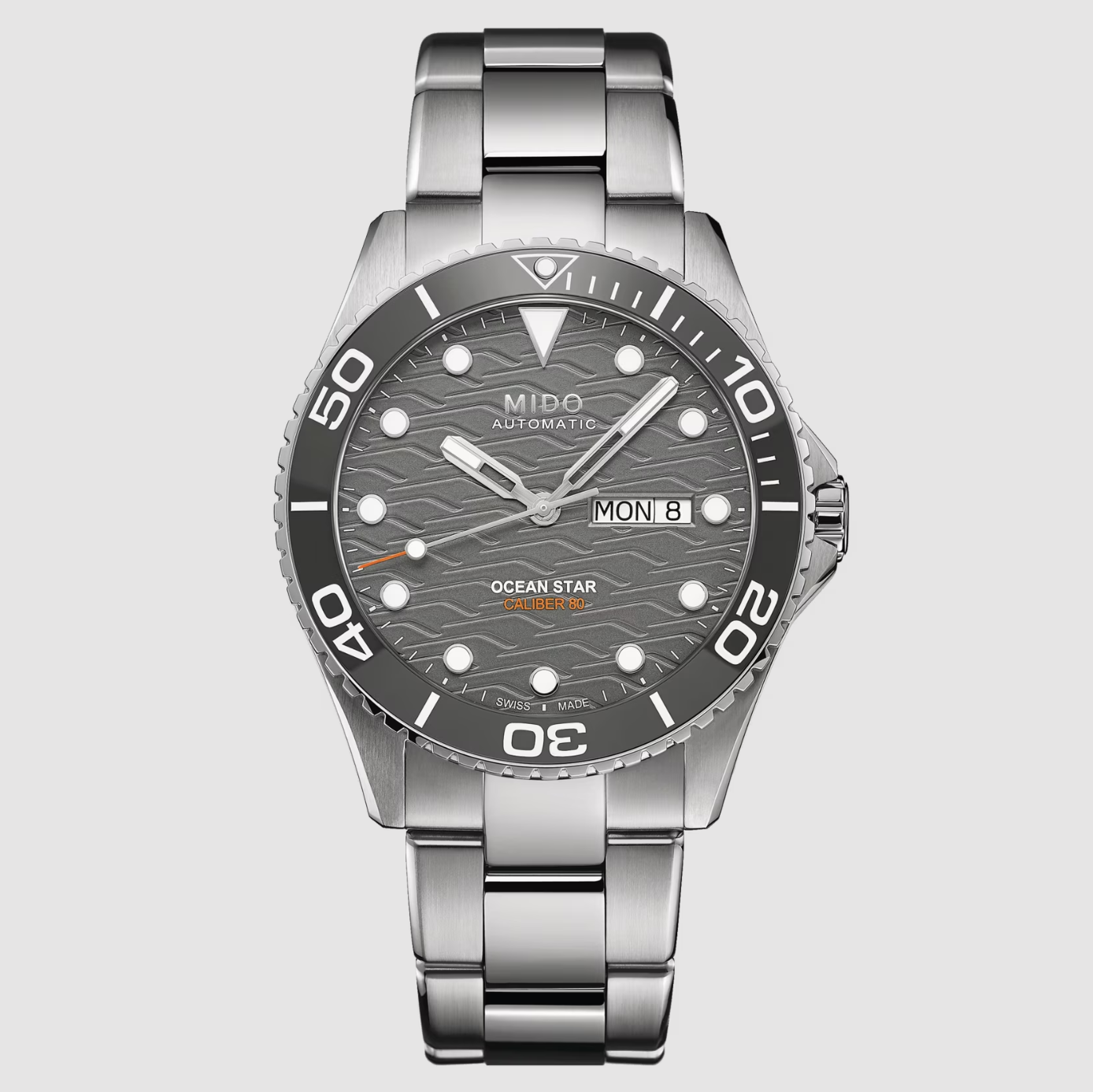 Mido ha inserito la ceramica – un materiale eccezionale per l’orologeria – nella lunetta rotante unidirezionale del suo Ocean Star 200C. Il quadrante è decorato con un motivo ondulato e con indici applicati individualmente, ricoperti da pigmenti di Super-Luminova® bianca. Questo orologio subacqueo è resistente fino a 20 bar (200m), con una forma della cassa che permette una protezione extra per la corona a vite. Il fondello della cassa è inciso con il logo Ocean Star. Il movimento automatico, inoltre, ha un’autonomia fino a 80 ore di riserva di carica.